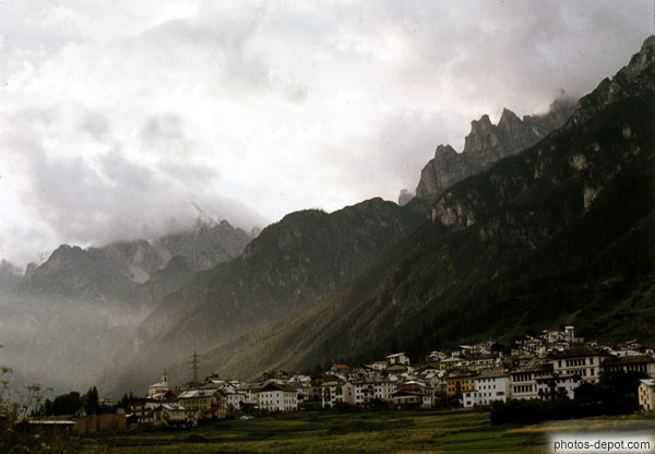 Village encaissé sous les montagnes menaçantes, Italie, Auronzo
