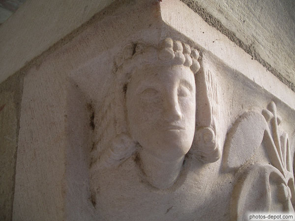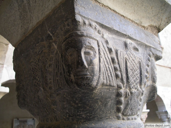Visage et coiffure, chapiteau de colonne du Cloître, France, Languedoc Roussillon, Saint Genis Fontaines