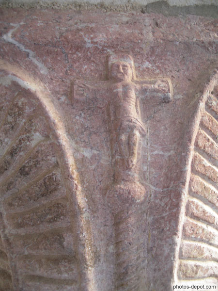 Christ en croix, marbre rose, Cloître, France, Languedoc Roussillon, Saint Genis Fontaines
