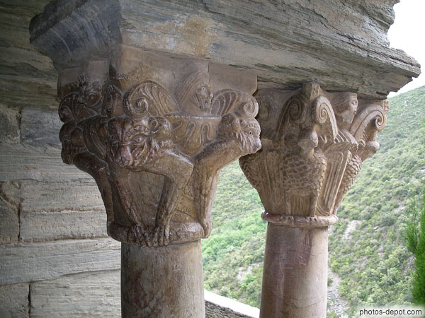 Griffon, Centaure, aigles, lions forment le bestiaire roman des chapiteaux de marbre rose, France, Languedoc Roussillon, Prieure de Serrabone