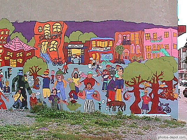 Foule bigarrée et maisons colorées, Canada, Quebec