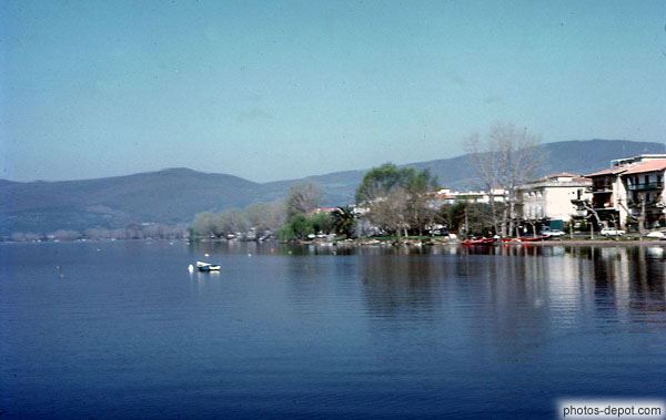 Rive du lac de martignano et batisse au loin, Italie, Braciano