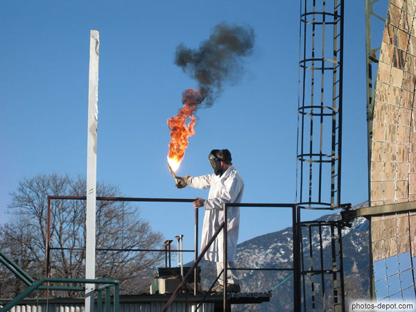 Four solaire concentrant les rayons du soleil , les 2000 degrés obtenus enflament instantanément un morceau de bois, France, Languedoc Roussillon, Cerdagne, Mont Louis
