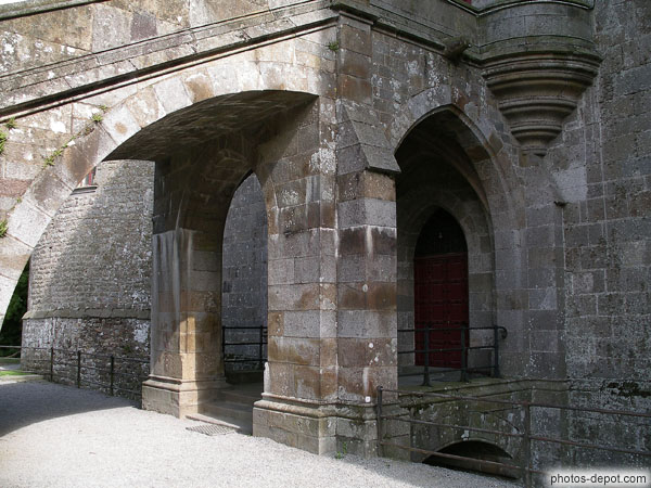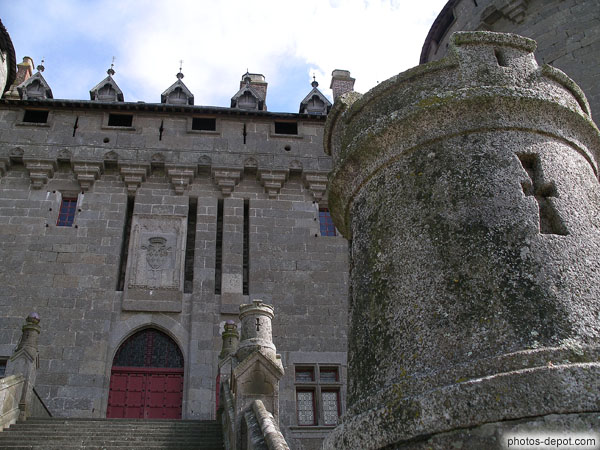 Facade Nord-Ouest, blason et taillades de l'ancien pont-levis, France, Bretagne, Combourg
