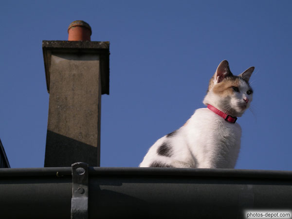 Chat dans la goutière et cheminée, France, Bretagne, Josselin