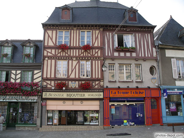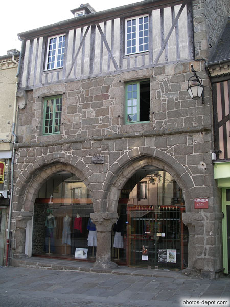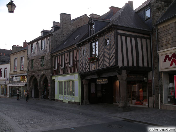 Magasins sous maisons à colombages, France, Bretagne, Dol de Bretagne
