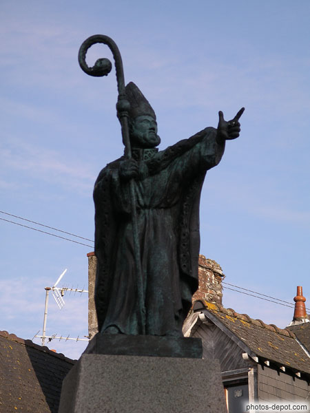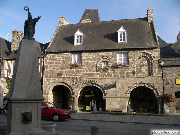 Statue de l'évèque devant maison les petits palets à belle arcature romane, France, Bretagne, Dol de Bretagne