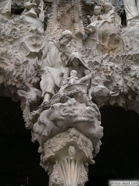 Jésus dans une mangeoire, surmonté de la Sainte Vierge et St Joseph, au centre de la facade de la Nativité, Espagne, Barcelone, Sagrada Familia