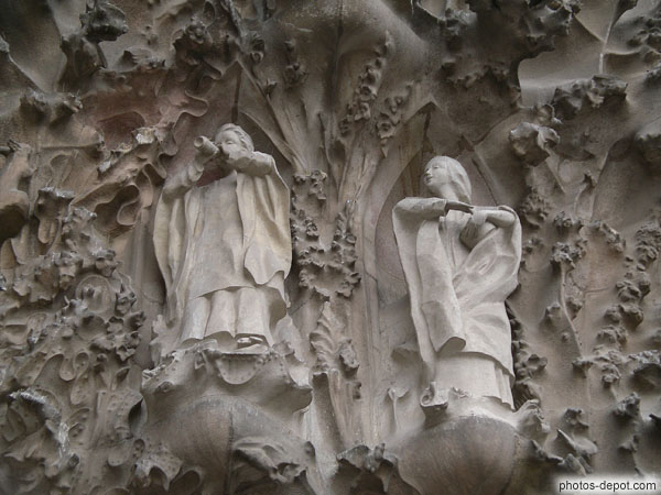 Anges musiciens jouant de la corne et du tambour pour la naissane de Jésus, Espagne, Barcelone, Sagrada Familia