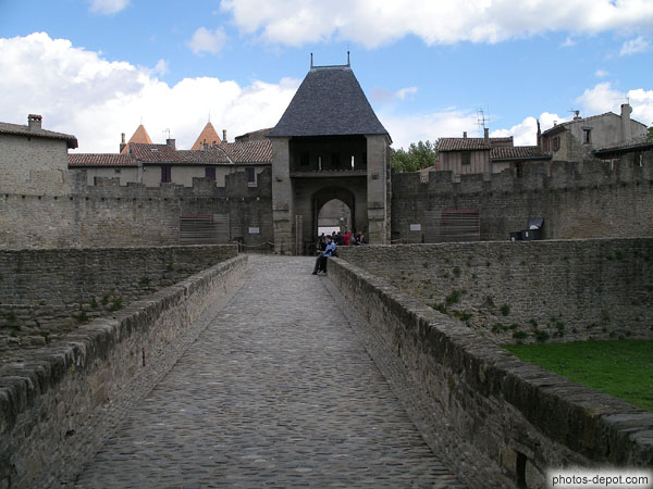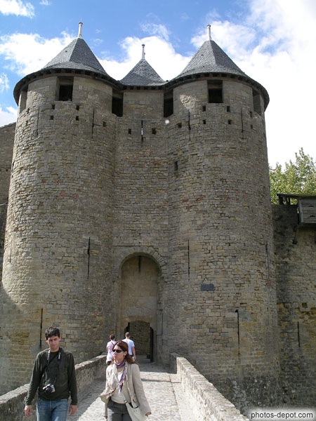 2 tours jumelles encadrant un corps central de défense très élaboré à 2 machicoulis, herse métallique et vantaux de bois, France, Languedoc Roussillon, Carcassonne