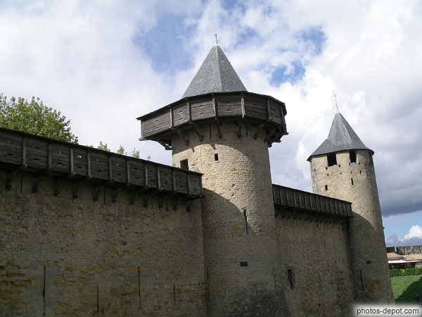Tours nord et murailles garnies de hourds de bois aux planchers ajourés permettant de lancer des projectiles, France, Languedoc Roussillon, Carcassonne