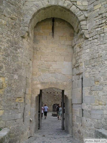 Entrée du chateau comtal protégé par des machicoulis, herse et vantaux, France, Languedoc Roussillon, Carcassonne