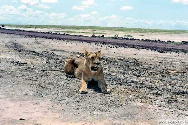 Lionne sur la piste, Afrique, Kenya