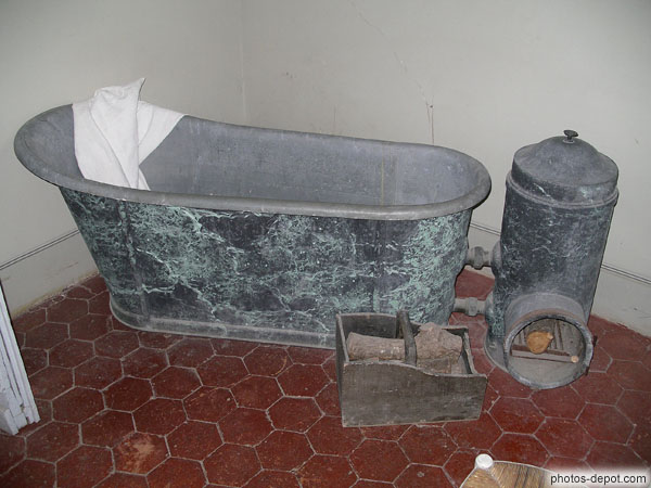 Vieille baignoire et poèle pour chauffer l'eau, France, Centre, la ferté St Aubin