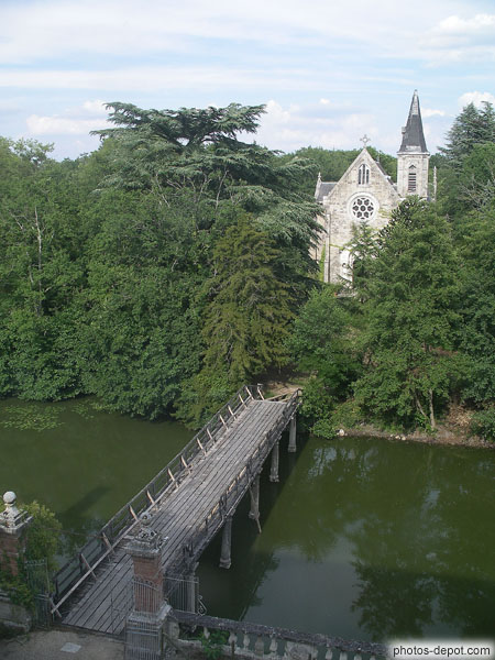 Traversée des douves menant à la chapelle neo-gothique, France, Centre, la ferté St Aubin
