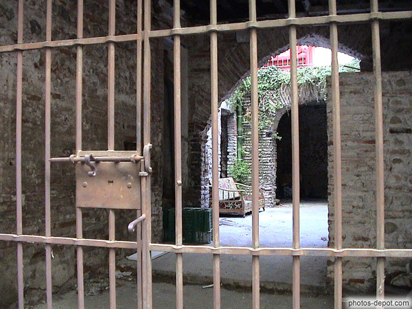 Grille et serrure de fer donnant sur cour intérieure, France, Languedoc Roussillon, Perpignan
