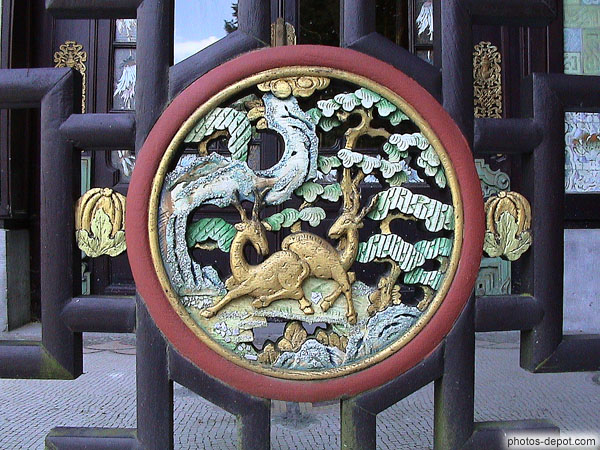Détail sculptures de bois rambarde pavillon chinois, Belgique, Bruxelles