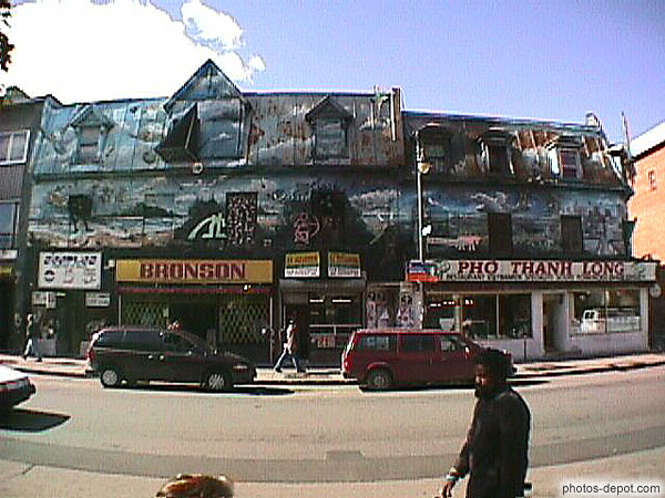 Scène peinte sur les maisons et leurs toits, Canada, Montreal