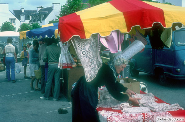Vendeuse de dentelle en costume et coiffe bretonne, France, Bretagne, Lesconil