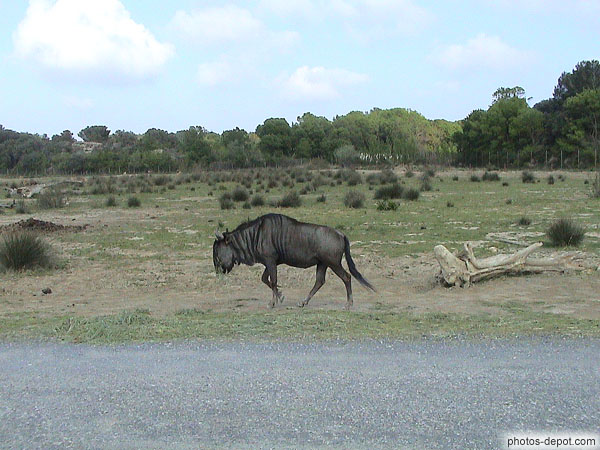 Gnou à queue noire. Il effectue d'immenses migrations entre la Tanzanie et le Kenya en suivant les pluies, France, Languedoc Roussillon, Réserve Africaine de Sigean