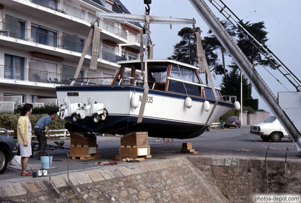 Grue soulève le petit bateau à moteur, France, Bretagne, Pornic