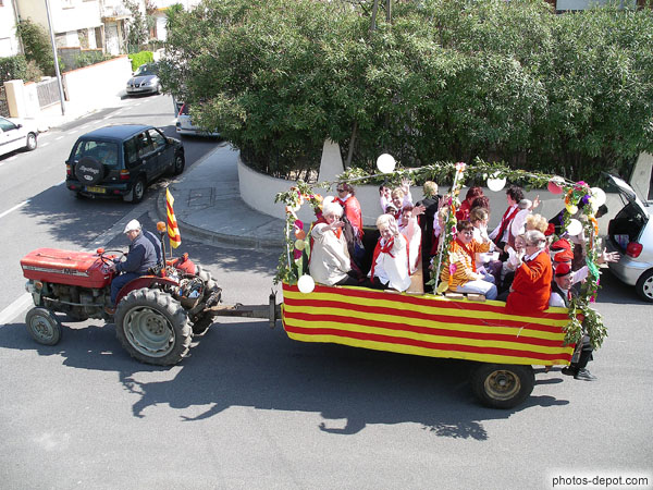 Els Cantaires de la Fossella sur leur remorque tirée par un tracteur, France, Languedoc Roussillon, Cabestany