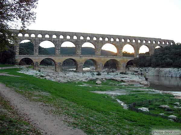 Pont du Gard et ses 3 niveaux aux blocs assemblés par ciselage des joints sur place. Certains blocs pèsent près de 6 tonnes, France, Languedoc Roussillon, Pont du Gard