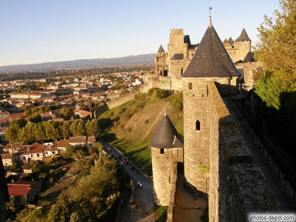 Remparts, Tours et descente à la porte d'Aude, France, Languedoc Roussillon, Carcassonne
