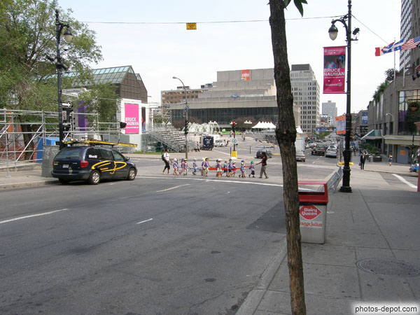 Enfants traversant la rue avec leurs maitresse place Desjardins, Canada, Montreal
