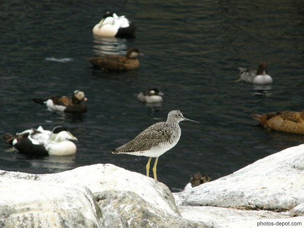 Chevalier gambette devant autres oiseaux, Canada, Montreal, Biodome