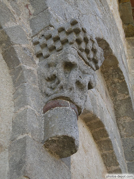Sculptures modillon surmonté de damier ou échiquier, Chapelle romane St Julien, France, Languedoc Roussillon, Villeneuve de la Raho