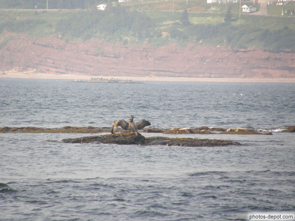 Cormoran à aigrette déploie ses ailes pour les sècher, Canada, Gaspesie, Percé