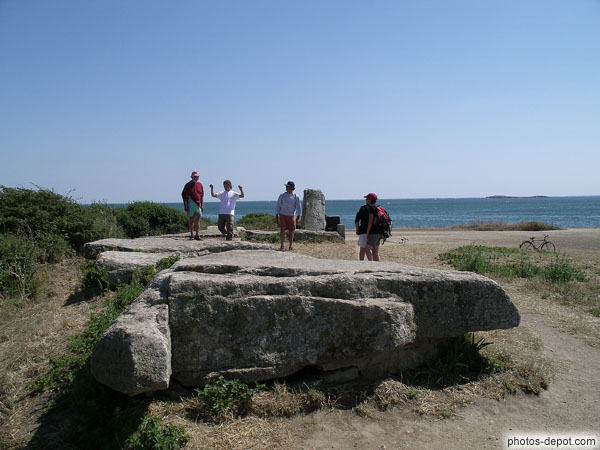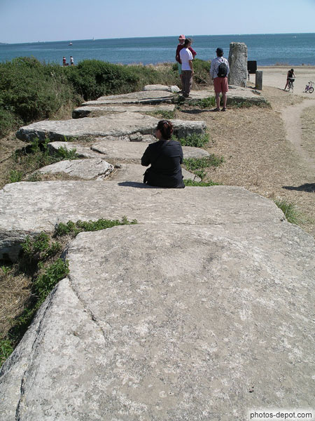 On marche sur les pierres du Dolmen des pierres plates, France, Bretagne, Locmariaquer