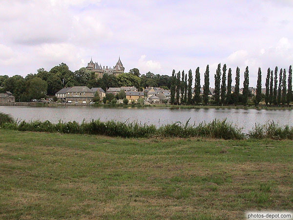 Château de ChateauBriand devant village et étang, France, Bretagne, Combourg