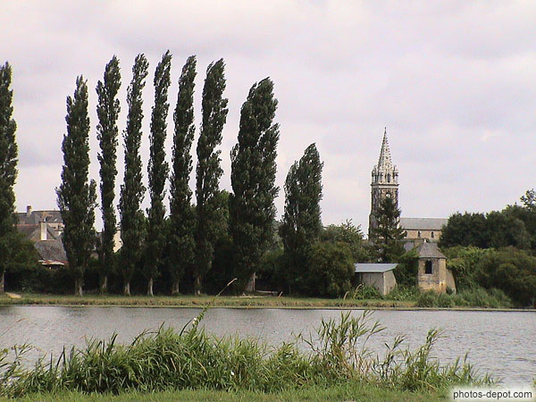Eglise, arbres et rivière, France, Bretagne, Combourg