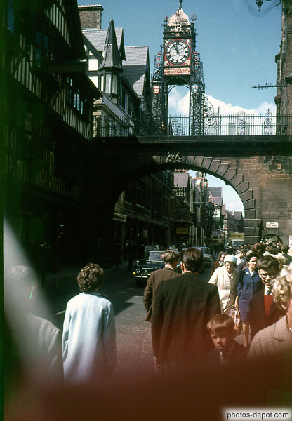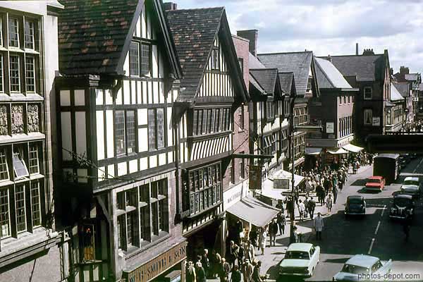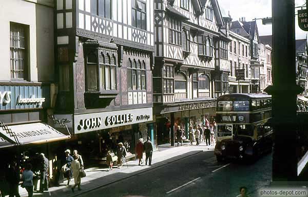 Magasins sous maisons à colombages et autobus, Angleterre, Chester