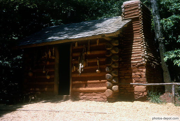 Baraque de bois aux ustensiles pendus et cheminée extérieure, USA, Virginie, Smokey Mountains, Blue Ridge Parkway, Shenandoah national park