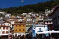 Maisons étagées multicolores à flanc de falaise au fond d'une crique formant le village