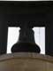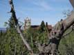 Dans le brouillard, donjon fortifié, chatelet surmonté de la cloche de l'horloge