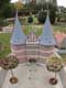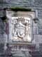 Blason de chevalier gravé sur la porte de bois représentant un chateau en flammes