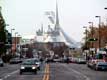 Tour penchée aux cables tenant le toit de toile du stade de montréal devant le biodôme
